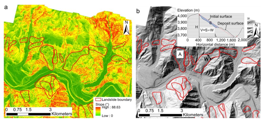 图1.基于高精度三维地形数据(a坡度图和b阴影图)的滑坡灾害识别及其几何特征提取