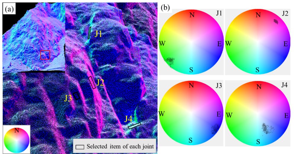 图2.基于无人机低空获取的精细坡体三维点云数据(a,图中红框长宽为100 m)及岩体结构面产状信息自动提取(b)