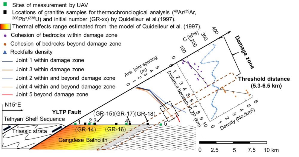 为此,星天地娱乐城官网 地质与地球物理研究所页岩气与地质工程院重点实验室副研究员王学良与研究员祁生文、张路青等合作者,基于青藏高原雅江缝合带加查-波密段的构造挤压和隆升背景,利用卫星遥感数据分析,无人机、LiDAR地表形貌特征精细测量(图1、2),岩体结构信息自动化处理和坡体强度参数反分析等技术手段,从区域-山体-岩体多空间尺度,研究了构造挤压作用下浅层地表坡体强度-岩体结构-滑坡灾害与深部热效应相协同的空间演化规律,区域滑坡的驱动机制及其空间分布的智能化识别方法等。研究发现,雅江断裂带的逆冲作用控制了岩体结构的发育、空间几何和力学强度特征。由断裂带核部到影响区边界,伴生雅江断裂带的构造结构面逐渐消失。随着构造作用的减弱,岩体结构面的密度不断减低,并与断层距离呈现出负指数的幂函数关系。上述岩体结构的空间演化也被历史崩滑灾害的分布及其块体大小的数据特征所印证。在力学强度方面,构造挤压作用的减弱导致斜坡岩体的力学强度参数(c和φ)与断层距离呈现出正指数的幂函数关系;在影响区之外,斜坡的岩体强度呈现出不再受构造作用的影响特征。对比前人在研究区对构造挤压的热效应研究结果,雅江断裂带逆冲挤压作用下浅地表岩体破裂的空间演化边界与其热效应的作用边界具有良好的一致性。综上所述,科研人员厘定了研究区雅江断裂带逆冲作用造成浅地表岩体破裂的影响范围为5.9±0.6km(图3)。