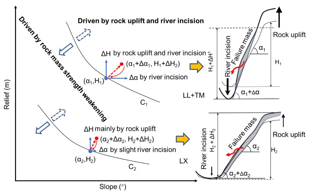 图4.基于库尔曼模型的构造抬升/河流下切驱动区域滑坡机制图