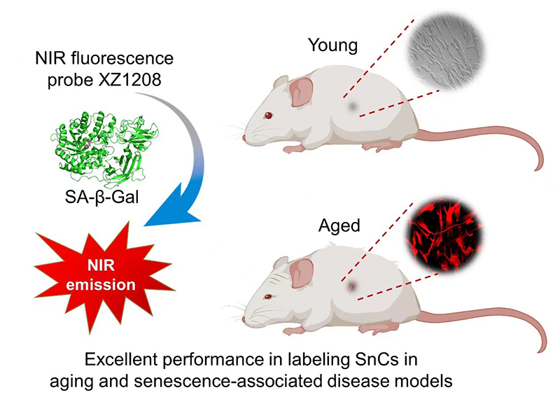 近红外探针XZ1208的作用示意图。年轻细胞的β-半乳糖苷酶(β-Gal)表达和活性较低,而衰老细胞则会高表达且呈现出较高活性的β-Gal(被称作SA-β-Gal)。XZ1208自身不产生荧光,但在SA-β-Gal的识别和剪切下能释放出近红外荧光染料,从而实现对衰老细胞的特异标记。在自然衰老、照射诱导和早衰症小鼠、纤维化及创伤-愈合等体内模型中,低剂量的XZ1208即可实现对衰老细胞的长效示踪。