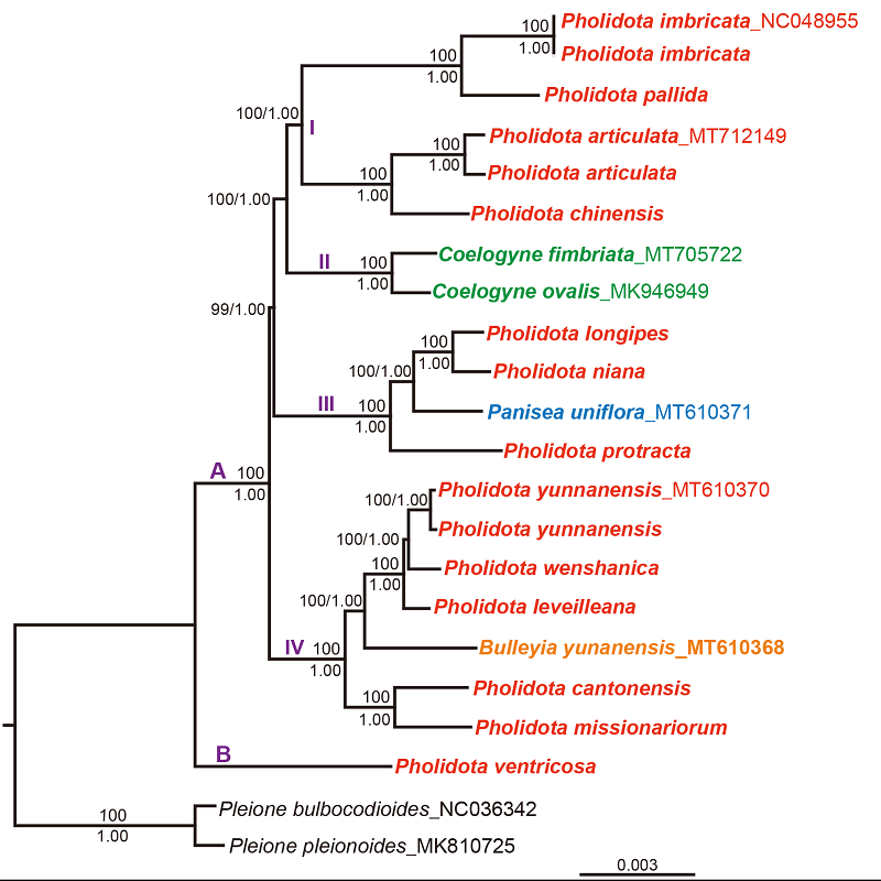 在综述之前工作的基础上,该研究基于叶绿体全基因组序列进一步探究了石仙桃属及其近缘属之间的系统发育关系。结果表明,传统意义上依据唇基囊状界定的石仙桃属为多系,分为四个主要分支(图1):狭义石仙桃属(Pholidota s.s)与包含贝母兰属(Coelogyne Lindl.)部分代表物种的一个分支构成姊妹群;另外两个分支分别与蜂腰兰属(Bulleyia Schltr.)和曲唇兰属【Panisea (Lindl.) Steud.】的代表物种聚在一起;P. ventricosa偏离该属所有其他物种,稳定处于系统发育树的基部。尽管唇基凹陷的性状在石仙桃属物种间表现出相似性,但经历了多次独立进化而产生,为非同源性状,而石仙桃属多数分支得到子房是否被毛、花苞片形态等形态共衍征的支持。