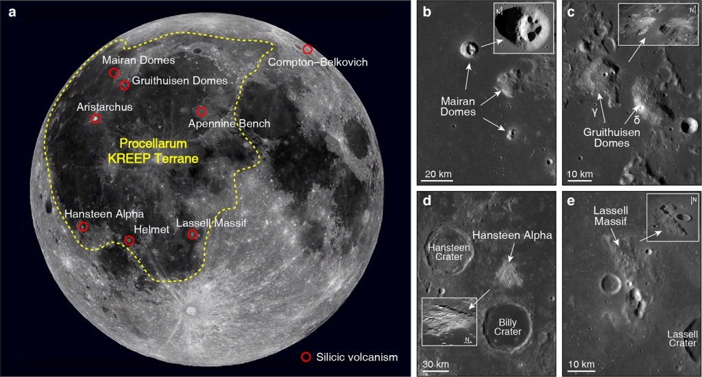 图1. 月球富硅火山建造出露位置(a)和代表性火山建造的月球勘测轨道器照相机