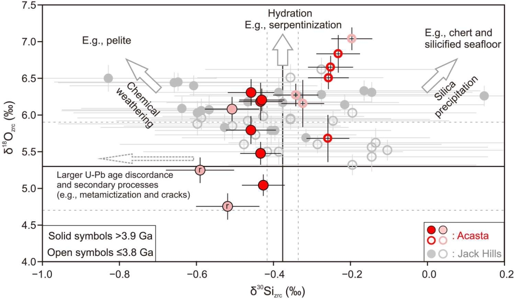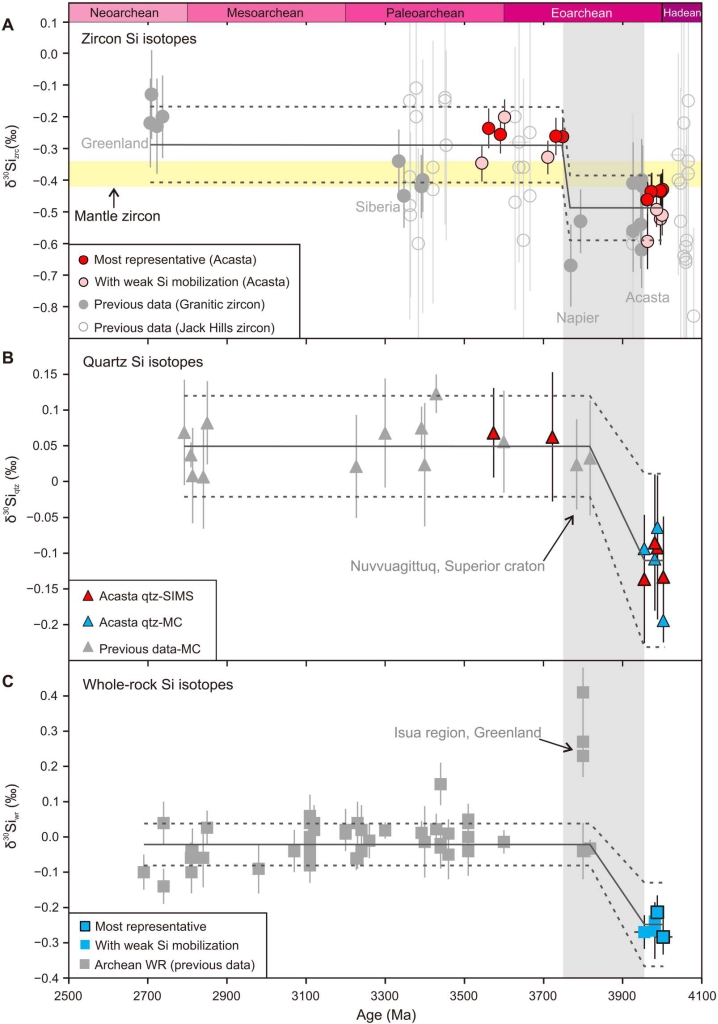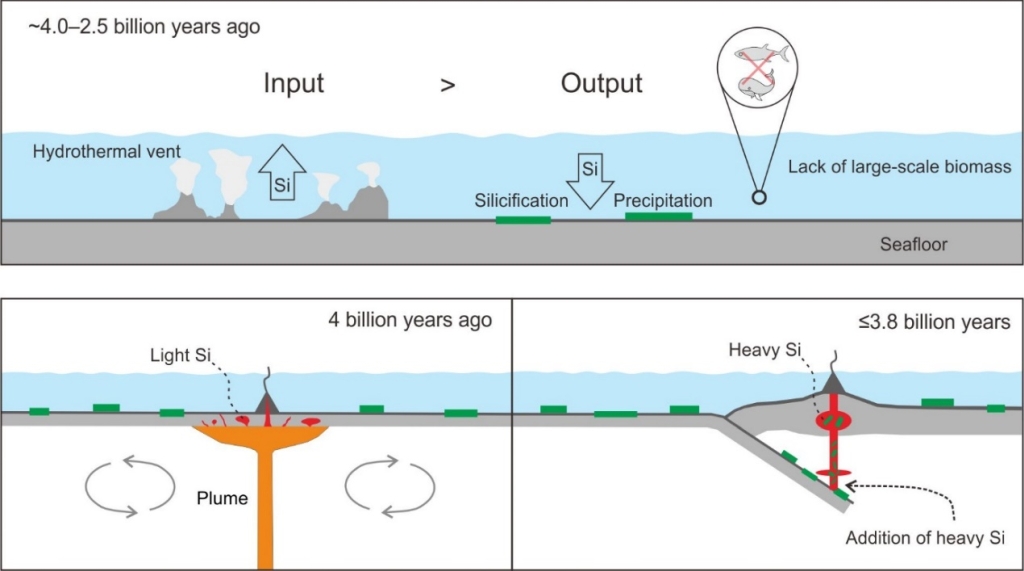 图3. 在40–25亿年前,海水中硅含量饱和,硅化洋壳富含重硅。研究发现最古老的40亿年的岩石形成过程中没有表壳重Si物质的加入,在约38亿年以来,表壳的重Si同位素信号才开始出现在花岗质岩中。