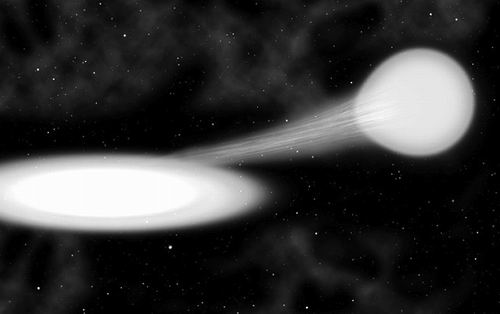 lax超新星很可能是在双星系统中形成的——一个密集的、富含碳和氧的白矮星(图左盘中心位置)从其富含氦的伙伴那里夺取资源,最终在其表面积聚了足够的质量并引起爆炸。天文学家可能仅仅发现了很少的lax超新星,这是由于它们的信号微弱,而不是因为数量少:研究团队推测,每发生100次la超新星爆发,其中大约有31次便是lax超新星爆发。