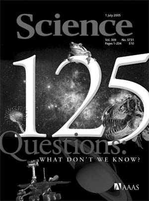 《科学》第一期出版于1880年7月3日。本期的专题部分通过探讨有关我们宇宙中最重要的、还没有解决的125个科学问题,来庆祝《科学》出版125周年。宇宙是由什么制造的?意识的生物学基础是什么?这个世界是否能够维持不断增长的人口和消费?编辑们最初的打算是选出代表我们目前科学知识欠缺的25个问题。但《科学》的评审编辑委员和资深编辑部共推荐了100多个候选题目,这些题目都很有意思,很难做出取舍。《科学》新闻部主编Colin Norman 说,“有些问题是很自然的选择;有些问题的选择在于它们的基本性质——对这些问题的回答将为几个科学领域提供更深的见解;还有些问题对目前的政策至关重要,比如有关HIV和气候变化的。”所以编辑们最终给出了一个125个问题的单子,在本期的专题部分,《科学》的新闻部对其中的在今后25年中有望解决,或至少知道如何解决的25个问题做了深入的报道。