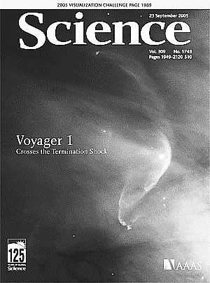 2004年12月16日前后,旅行者1号飞船跨越了一个重要的里程碑:它越过了“激波边界”,这是太阳风与被称为“星际介质”的恒星间气体和尘埃混合的区域。本期专题部分“观点”文章的作者Len Fisk写道,旅行者1号现在进入了“未知的那边”。专题部分还包括了4篇报告,每篇报告分别描述了旅行者1号越过我们太阳系的这个外部边界前后获得的技术细节。在激波边界,以超声速运动的太阳风变慢,速度降低到声速以下。激波边界环绕整个太阳系,它的具体位置部分地随太阳风的性质而变化。本期两篇报告说,正如所预测的,低能粒子的强度在激波边界突然增加。但是另一篇报告指出,与预测相反,高能粒子没有加速。Fisk说这个发现体现了太空探索的理念:我们进入新的地方时会有新的发现。