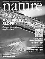 在水面上行走的昆虫依靠表面张力支撑其重量:当它们需要到干的地方去时,它们就会碰到一个障碍,即水的边缘半月形的很滑的斜坡(即弯月面)。水对于我们来说是平坦的,但对于一只昆虫来说,只有几毫米长的这些弯月面看起来一定像是没有摩擦力的山坡。一项将实验和理论结合起来的研究工作显示,攀爬弯月面的昆虫能够利用漂浮物体之间的毛细管吸引力。这些昆虫会将自己锁定在一个静止的姿势,使自由表面变形,从而产生一个侧向毛细作用力,这个力推动它们往弯月面上爬,爬升的速度最大可达每秒30个身体长度。攀爬弯月面是一种独特的推动方式,之所以独特,是因为它并不要求昆虫移动自己的肢体。本期封面所示为一只名为Mesovelia的昆虫从右向左攀爬一个弯月面。