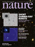 伽马射线暴(GRB)要么是“长而软的”,要么是“短而硬的”。持续时间长的类型会留下很长的余晖,而且已经受到广泛的研究,所以我们对它们是由什么造成的很了解:它们是由遥远的形成恒星的星系中巨大恒星的爆炸造成的。短伽马射线暴(没有很强的余晖)比较难以观测。去年11月发射的Swift卫星是设计用来在伽马射线暴刚一发生就对其进行观测的。事实证明,该卫星对观测长伽马射线暴是有用的。现在,它又观测到了一个短的伽马射线暴,编号为GRB 050509b,精确测量了其位置,并且探测到了其X-射线余晖。本期《自然》杂志上4篇论文报告了这一伽马射线暴及另外3个最近发生的短伽马射线暴。现在,在它们被首次发现20年之后的今天,我们才弄清楚,短伽马射线暴可能来源于一个双星体系的两颗恒星的合并以及一颗黑洞的同时产生。