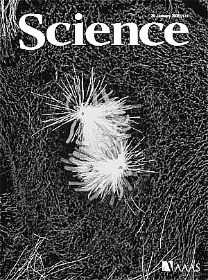 新的正在分裂的哺乳动物细胞的图像使科学家对一些染色体在相等地分离和分布到两个子细胞之前如何排列有了更好的了解。如果细胞分裂过程中出错,分离后的子细胞得到过多或过少的染色体,会导致出生缺陷和某些癌症的发生。为了保证相等分离,在细胞分裂过程中染色体“双轴取向”,分别用微管与细胞的相反两极连接,然后聚集在细胞赤道板,最后分裂开。Tarun Kapoor和同事现在揭示,出乎意料的是,只与细胞一极连接的染色体,能靠其他双轴取向的染色体建立的微管,也聚集到细胞的赤道板。研究人员还发现了一个帮助这些没有双轴取向的染色体沿微管向赤道板滑动的蛋白,在赤道板这些染色体与细胞的另一极建立连接。一篇相关的研究评述进一步讨论了这些发现。本期封面与这篇报告有关。