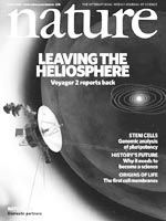 2007年8月30日,“旅行者2号”开始穿过“激波边界”。这是由太阳与银河系其他部分相互作用所产生的一个边界。在这个地方,超音速的太阳风向外压迫周围环境中的星际物质,因而会突然减速。本期Nature上5篇Letters论文发布了该探测器发回的数据。“旅行者2号”的穿越点与太阳的距离比“旅行者1号”要近大约15亿公里,说明日球是不对称的。来自等离子体实验、低能粒子、宇宙射线、磁场和等离子体波探测器的结果,显示了一个复杂的、动态的激波,其本身的改变发生在几小时内,而不是几天内。下一个探测器穿过“激波边界”也许要在几十年之后,但远距离观测现在可以填补这段时间所留下的空白。Wang等人所作的研究就证明了这一点:他们报告了STEREO A和B宇宙探测器对日鞘中高能中性原子所作的测量,这两个探测器与“旅行者”探测器同一时间所做的近距离观测形成互补。在News & Views文章中,Randy Jokipii对“旅行者”所获得发现的意义进行了分析。另外,本期Nature还发布了“旅行者”探测任务行星阶段的历史图片。与此同时,“旅行者1号”和“旅行者2号”正在向星际空间进发,所以可能还会获得更多发现。