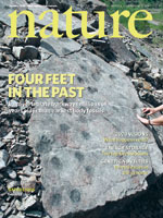 近4亿年前由四足陆地脊椎动物踩踏出的化石行迹的发现,将使人们对我们关于四足动物起源的认识进行重新评估。由Per Ahlberg及其同事获得的这些发现来自波兰圣十字山中的Zachelmie采石场。其中一些行迹保存非常完好,使人们可对足迹形态进行仔细研究,它们 像是原始四足动物“鱼甲龙属”所留下来的。但使得这些行迹显得如此特殊的还是它们的年龄:它们比已知最早的四足动物身体化石要早1800万年,比最早的 Elpistostegids(Tiktaalik、Panderichthys和它们的近亲,被看做是鱼类与四足动物之间的过渡形式)要早1000万 年。这些发现表明,我们所知道的Elpistostegids是后来幸存下来的,而不是直接的过渡形式,它们反映了我们对于陆地脊椎动物最早历史的了解有多么少。本期封面所示为Zachelmie采石场的一块石板,其上有一个行迹和一个有四趾印的孤立足迹,这些印记用木炭凸显了出来。