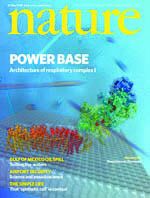 Complex I是呼吸链的第一种酶,它通过将NADH和苯醌之间的电子转移同质子转位耦合起来,而在线粒体中的细胞能量生产中扮演一个中心角色。这个巨大的复合物是呼吸链的最后环节,其机制和完整结构过去并不为人们所知。现在,来自大肠杆菌的Complex I的膜区域以及来自温泉菌(嗜热菌)的完整Complex I的结构已被确定。这些结构提供了关于耦合机制的有力线索:两个主要区域界面上发生的构形变化,会驱动一个长阿尔法螺旋发生一种活塞式运动,使附近跨膜螺旋倾斜,导致质子转位。本期封面图片所描绘的是来自嵌入在类脂双层中的温泉菌(嗜热菌)的呼吸链Complex I。每个亚单元都用不同颜色表示,亲水区域中的Fe-S簇显示为球形。背景所示为偏振光下的膜区域的晶体。