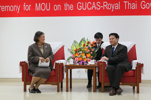 研究生院与泰国公务员委员会办公室合作备忘录》续签仪式。中科院研究生院党委书记、中科院副秘书长邓勇在玉泉路校区礼堂一楼接待室会见了来访的贵宾。诗琳通公主一行包括泰国驻华使馆、泰国公务员委员会(OCSC)、泰国高校代表等40余人。此行是诗琳通公主第三次访问研究生院。
