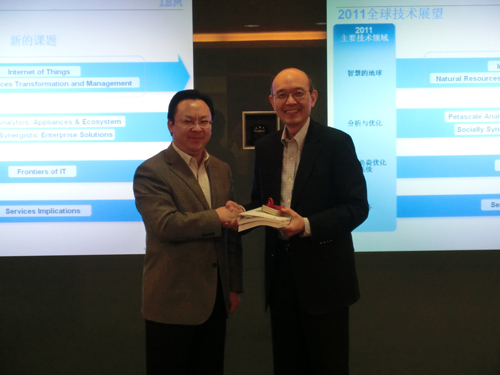 IBM中国研究院院长李实恭(Thomas Li)介绍了IBM研究院的发展历史、IBM全球研究体系、近十年产出的研究成果、IBM研究战略及2011年全球技术展望等方面的情况。谭铁牛对IBM全球各研究中心的研究焦点、IBM对未来技术的预测过程等表示关注。双方表达了未来在科研信息化领域开展实质性合作的愿望。