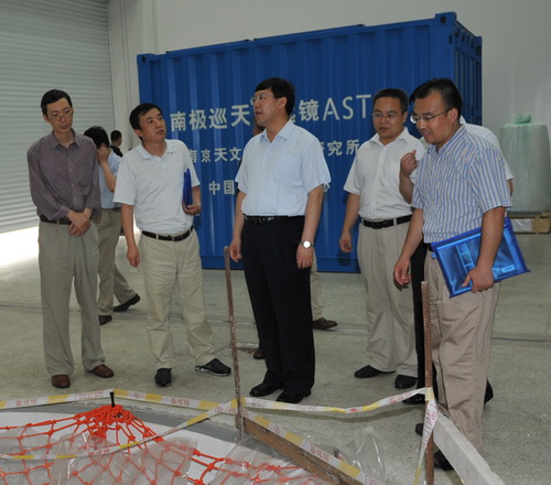 在南京天光所,阴和俊参观了正在研制中的南极巡天望远镜AST3、2.5米望远镜和垂直检验塔、镜面技术实验室等。天光所所长朱永田向阴和俊一行汇报了近年来取得的主要科技创新成果以及未来发展的设想。阴和俊对南京天光所取得的成绩尤其是LAMOST项目的成功研制给予肯定,并希望天光所能在空间科学等方面进一步发挥作用。