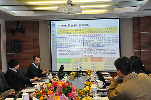 詹文龙一行首先听取了国家天文台台长严俊关于国家天文台年度总体工作情况和战略发展调研情况的汇报,之后依次听取了党委副书记赵刚、副台长郑晓年,以及颜毅华研究员关于郭守敬望远镜先导巡天观测、FAST项目建设进展和工程管理,以及新一代射电日像仪的初期运行调试的工作汇报。詹文龙肯定了国家天文台的总体科研工作向目标明确、优势集中发展的态势,并希望充分加强学术委员会的作用以及与天文口大系统的沟通和协调,使国家天文台战略内容进一步充实和具体化。詹文龙详细询问并了解了分别处于不同阶段的三项科学工程项目的具体情况,并就下阶段工程建设和管理提出了具体建议。
