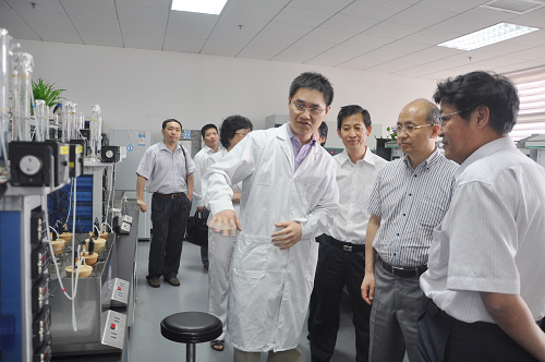 张亚平首先参观了微生物功能基因组学与生物技术、系统与合成生物技术、微生物代谢工程和分子进化等实验室,详细了解研究所在生物质糖化、生物基材料、生物燃料、工业酶制剂等领域的科研进展以及成果转移转化情况;随后,参观了发酵模拟与仿真平台,听取了工作人员对发酵平台的DCS控制系统的介绍,仔细了解了生物质原料的预处理技术、发酵过程优化工艺体系、酶与细胞催化与转化系统,工业发酵后提取、分离纯化工艺体系的建设运行情况,对研究所的科研工作以及平台建设表示赞赏。
