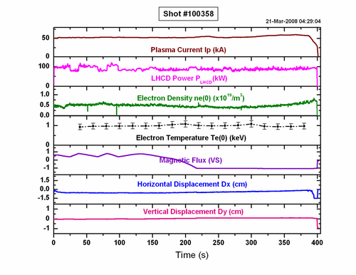 HT-7共进行了近20轮放电实验,总放电次数为118000次。开展了石墨限制器条件下的运行模式、等离子体物理特性和波加热、波驱动高参数等离子体物理特性研究,探索实现了HT-7高参数、长脉冲运行模式等世界聚变前沿课题研究,为实现稳态参数等离子体开辟了新的思路。2003年3月,HT-7获得可重复的大于60秒放电时间,最长放电时间达到63.95秒,高约束等离子体存在时间为220倍能量约束时间;获得了最高电子温度超过5000万度的等离子体。实验结果表明,HT-7成为继法国Toresupra装置之后,世界上仅有的两个可进行高参数稳态条件下等离子体物理研究的国际合作平台之一。2008年3月21日凌晨, HT-7连续重复实现了长达400秒的等离子体放电,电子温度1200万度,中心密度0.5×1019/立方米,创造了当时国际同类装置中时间最长的高温等离子体放电的新纪录。