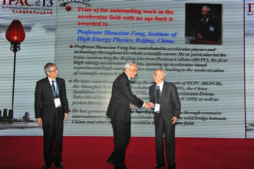 在刚刚结束的第四届国际粒子加速器大会(IPAC’13)上,亚洲未来加速器委员会(ACFA)主席野崎光昭教授和IPAC’13奖励委员会主席陈佳洱院士向方守贤院士颁发了ACFA-IPAC’13的最高奖项——终身成就奖。ACFA奖每三年颁发一次,在当年召开的国际粒子加速器大会(IPAC)上颁发。ACFA-IPAC奖共设有A、B、C三个奖项,通常分别称为终身成就奖、杰出成就奖和青年成就奖,奖励在粒子加速器领域做出杰出贡献的个人。