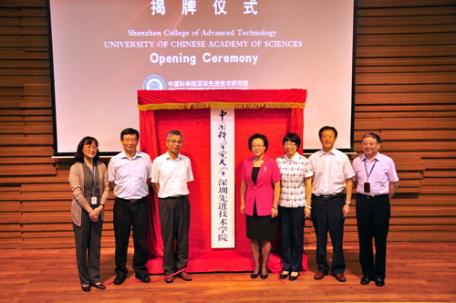 中科院广州分院院长黄宁生(左二)、国科大副校长马石庄(左三)、深圳市副市长吴以环(右四),深圳市教育局局长郭雨蓉(右三)为国科大深圳先进学院揭牌,樊建平(右二),先进院党委书记、副院长白建原(左一),副院长吕建成出席揭牌仪式