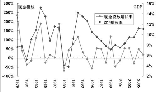 转轨前的中国经济,基本上是政府操控的实体经济,金融体系不过是实体经济的会计、出纳部门,因而金融与实体经济关系密切。图三是现金投放的增长率与GDP的增长率,数据显示,1995年以前,两者存在一定的同步性,控制现金投放量曾是政府调控经济增长率的重要手段,而1995年后,两者显出各顾各的走势。可见对转型而言,1995年是个重要的转折点。