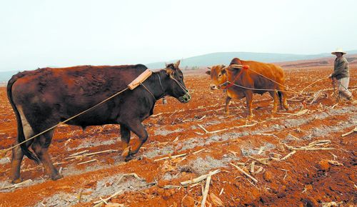 去冬今春以来,云南遭遇百年一遇的严重旱情。图为云南省宣威市板桥镇永安村的村民在犁田,准备改种较为耐旱的马铃薯。 新华社供图