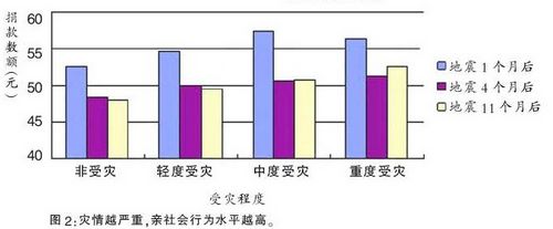 第二个是现场研究。2008年的汶川地震无疑给灾区人民造成了巨大的物质和精神损失,这就使得地震灾区人民处于明显弱势。在汶川地震发生1个月(2008年6—7月)、4个月(2008年9—10月)和11个月(2009年4—5月)后,研究者分三次调查了灾区(四川、甘肃)和非灾区(河北、北京、福建)近8500名居民的亲社会行为水平。调查结果显示,随着居住地灾情严重程度的增加(从非受灾、轻度受灾、中度受灾到重度受灾),居民的亲社会行为水平也随之增加(如图2)。这表明,弱势程度越高,人们的亲社会行为水平越高。但是,随着时间的流逝,由地震造成的弱势逐渐减缓,居民的亲社会行为水平也随之降低。