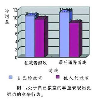 第一个是实验室研究,选取某幼儿园中班儿童为参与者。研究者推测,在他人地盘所作的合作决策应不同于在自己地盘所作的合作决策,儿童感知到自己在领地、资源上的劣势时,会表现出更多的合作行为。结果发现,在两个博弈游戏(独裁者游戏和最后通牒游戏)中,“地头蛇”(处于自己教室的学童)都表现出更强势的竞争行为;而处于他人教室的来访者则有更多的亲社会行为。同时,“独裁者”(掌握分配决定权的学童)也表现出更强势的竞争行为;而在游戏中没有掌握分配决定权的学童则有更多的亲社会行为(如图1)。