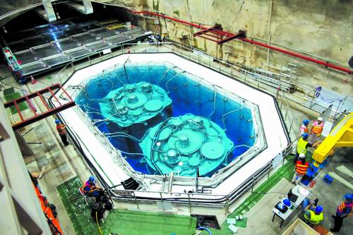 两个直径5米、高5米、重110吨的中微子探测器安装在大亚湾中微子实验站巨型水池中,水池灌满超纯水。