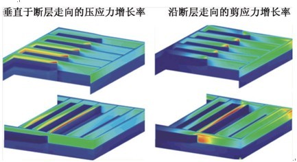 图二,对于类似龙门山断层走向和力学性质的断裂,汶川大地造成的震库伦应力变化。
