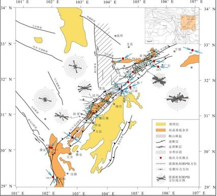 图三、蓝色箭头表示汶川地震后钻孔应力解除测量到的主压应力方向(据陈群策,2013)