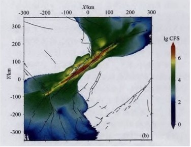 图二中表示的是:汶川大地震后,如果一个地方存在类似汶川地震的北东-南西走向的断层,在原来的构造应力场背景下,断层是变得更危险了,还是更安全了(库伦应力增大了还是减小了)?所有彩色部分都多多少少变得更危险了:红色部分应力增加可以到数兆帕,黄绿部分为零点几兆帕,绿色部分为百分之几兆帕。龙门山断层东北端以外断层以东西走向为主,不存在NE-SW走向的断层。但龙门山断层的西南段部分,汶川地震中并未破裂,其库伦应力有明显增加(图二)。