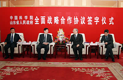 副院长施尔畏,中纪委驻中科院纪检组组长王庭大,中科院副秘书长邓麦村,山东省委书记、省人大常委会主任姜异康,山东省委秘书长王敏,山东省副省长李兆前等领导出席了签字仪式。施尔畏副院长主持了签字仪式。 姜异康在会谈中对中科院长期以来为山东省经济社会发展给予的支持表示衷心感谢。他指出,山东省不光是工农业大省、海洋大省,还是人口大省。山东在加速发展、迎接下一个发展周期的准备过程中,必须转型蓄势,提高科技含量,加快科技进步和自主创新。希望通过签署新一轮的全面战略合作协议,使中科院在山东的科研机构得到更好的加强,其作用得到更加充分的发挥。山东省将为中科院科研机构的工作开展提供全方位的服务和保障,使山东能够真正成为一个人才聚集、事业发展的平台,成为建设创新型社会、创新型省份的一个重要平台。 路甬祥在讲话中指出,中科院与山东省的合作经验证明,科技与科技转化需要两个动力,一是科技创新的动力,二是经济社会发展需求的动力。双方的成功合作对于共同应对金融危机,支持科学发展,建设创新型国家,走更加可持续发展的经济增长道路具有深远意义。在接下来的合作中,双方将以农业、海洋与海岸带、先进材料与先进制造、生物产业、信息产业、生态环境保护等领域作为合作重点,进一步解放思想,创新体制机制,共同探索一条提升自主创新能力,建设有中国特色的创新体系,建设社会主义创新型国家的道路。 山东省委、省政府有关部门,中科院办公厅、院士工作局、资环局、高技术局、院地合作局、规划战略局、人教局、农业项目办公室、及沈阳分院、海洋研究所、青岛生物能源与过程研究所、烟台海岸带可持续发展研究所等单位领导出席了签约仪式。