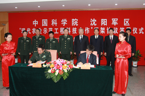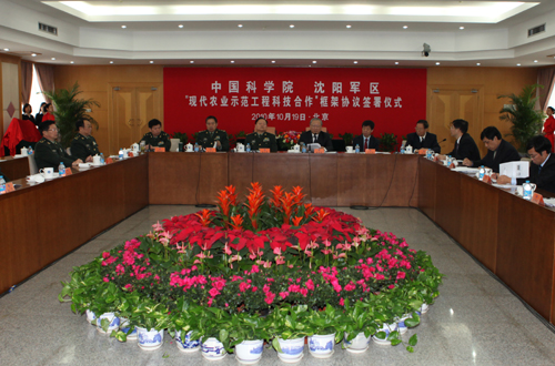 10月19日,中科院与沈阳军区在北京举行《现代农业示范工程科技合作框架协议》签字仪式。中科院院长路甬祥、副院长李家洋、原副院长李振声、副秘书长潘教峰,沈阳军区司令员张又侠、副司令员宋才文,解放军总后勤部军需物资油料部部长周林和,沈阳军区联勤部部长王爱国、副部长刘志明出席仪式。中科院党组成员、秘书长邓麦村主持会议。