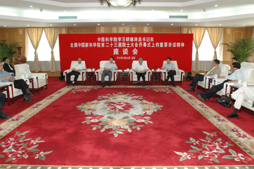 在北京召开座谈会,贯彻落实国家主席胡锦涛在发展中国家科学院(TWAS)第23届院士大会开幕式上的重要讲话精神。中科院院长、党组书记白春礼参加座谈会并发表讲话。
