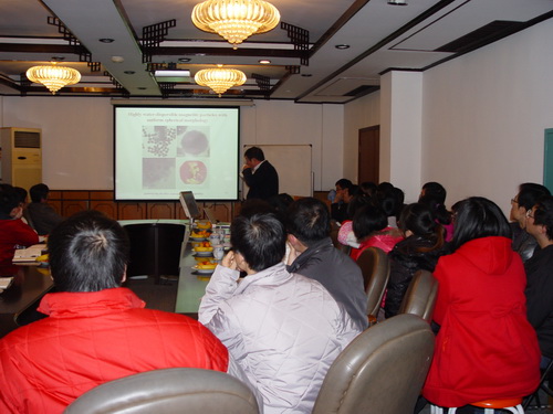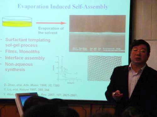 赵东元院士深入浅出地讲解了介孔材料合成、性质与应用等,围绕介孔分子筛材料的发展,重点介绍了一种采用两亲性表面活性剂模板法合成高度有序介孔酚醛树脂聚合物,以及经碳化后得到连续骨架结构的有序介孔碳材料。同时介绍了两种规模化合成方法,可制备公斤级有序介孔碳材料,并用于催化、电化学超级电容器和水处理。