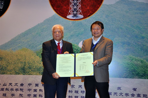 中科院国家天文台台长严俊向陆埮院士颁授“陆埮星”证书