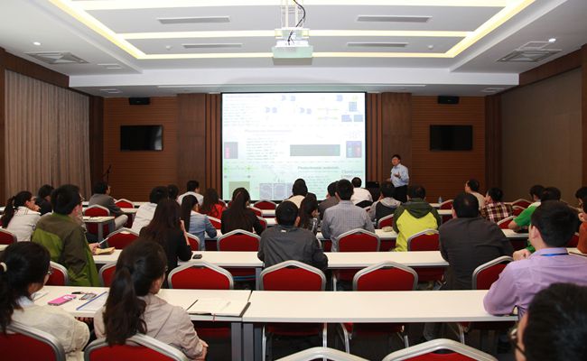 田禾介绍了通过染料分子工程发展太阳能电池的最新进展,特别是利用donor-p-acceptor概念设计合成不含金属的系列新型染敏剂的工作。其幽默风趣的讲述方式、谦逊的品格给与会者留下了深刻印象。报告结束后,在场科研人员与田禾进行了热烈的交流与讨论。
