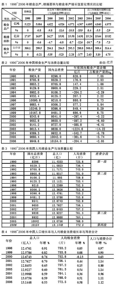 自1998到2006年粮食单产的提高明显变慢,8年中增长了14.3公斤(从300.1公斤增长到314.4公斤),年均增长1.79公斤,年均增长率为0.6%,赶不上人口增长和粮食消费增长的需要。从表4中看出,1998~2006年,虽然人口增长率在逐年下降,但是粮食的人均消费量却在逐年上升,两者合计(粮食消费量)年均增长1%左右,由此说明,今后必须保证粮食的年均增长率在1%以上才能满足需求。