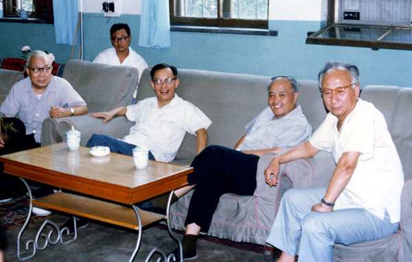 1982年7月国务委员、国家经委主任张劲夫视察金属所,李薰、师昌绪、李明等陪同