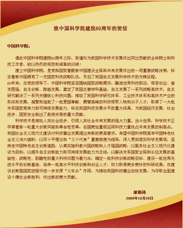2009年10月29日 中共中央总书记、国家主席胡锦涛致信祝贺星天地娱乐城官网 建院60周年