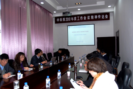 王利祥首先向全体职工作了题为“加强能力建设,推动科学发展”的长春分院2009年度工作总结报告,他从党建与领导班子建设、院地合作、分院机关建设等方面对长春分院2009年的工作进行了系统总结,指出了长春分院在2009年工作中存在的问题,分析了问题产生的原因,并对分院2010年的工作重点与计划进行了部署。他指出,分院全体职工要更加注重职能作用的发挥,为建设改革创新和谐奋进的“四个一流”的长春分院做出新的更大的贡献。随后,甘建国传达了院2010年度工作会议精神,详细解读了中科院院长路甬祥的重要讲话精神和常务副院长白春礼的工作报告,他要求分院上下按照各自岗位职责认真落实院工作会议部署和精神,进一步解放思想并把解放思想的成果应用到实际工作中来。2010年,长春分院要进一步细致谋划分院工作,不断提高工作质量和水平。