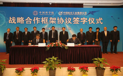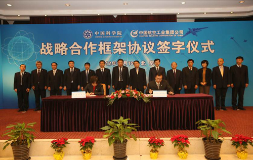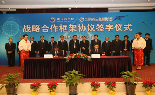 签约仪式上,阴和俊和徐占斌分别代表中科院和中航工业集团签署了战略合作框架协议。哈尔滨东安发动机(集团)有限公司与中科院金属研究所签订了合资设立哈尔滨东安高精管业有限公司协议,中科院生物物理研究所与航空总医院签订了共建北京转化医学研究院合作协议。