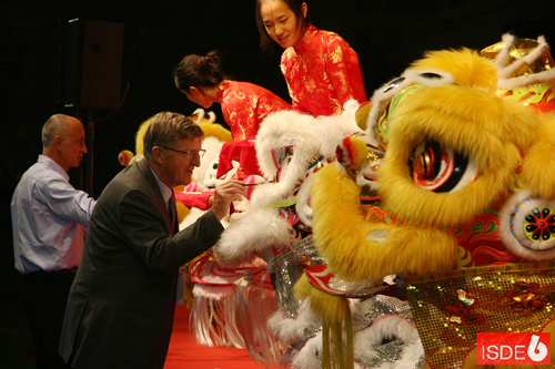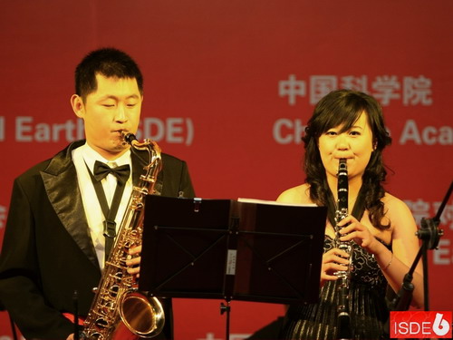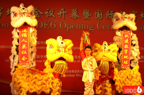 晚宴上举行了杂技、舞蹈等颇富中国传统的文艺节目。其中,由对地观测中心艺术团表演的节目充分展示了对地观测中心青年人的蓬勃活力和多才多艺,得到了大家的一致好评。在最具中国传统文化的舞狮节目中,美国科学院院士Michael F.Goodchild与GEO秘书处主任Jose Achache共同上台为雄狮点睛。被唤醒了的雄狮舞动在台上,为来宾们带来了技艺精湛、威武雄健的表演。最后,在“共建数字地球造福人类社会”的吐福惊喜中,晚宴走向了高潮。