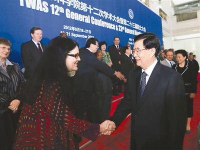 9月18日,国家主席胡锦涛在天津出席发展中国家科学院第十二次学术大会暨第二十三届院士大会开幕式并致词。这是胡锦涛在开幕式前亲切会见出席大会的部分来宾。新华社记者 兰红光摄