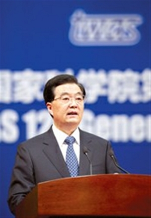 胡锦涛在致词时首先代表中国政府和人民,对大会的召开,表示诚挚的祝贺!对来自各个国家和地区的院士、科学家和各界人士,表示热烈的欢迎!