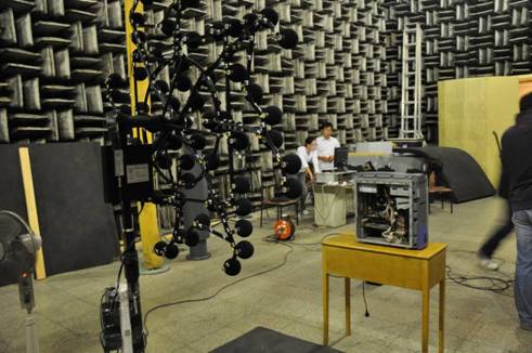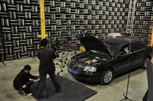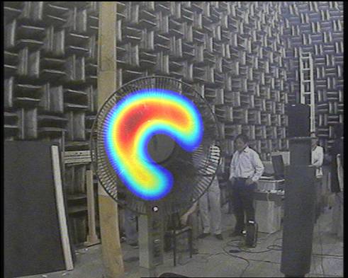 目前,声相仪在工业上主要用于鉴别噪声源的位置,可以用来分析飞机飞行中汽车、火车行驶中发出的各类噪声。检测电动机、发机电、汽柴油机、空调、冰箱、洗衣机、电话机、程交换机、计算机等各种设备的噪声。下图便是半消声室中测量汽车噪声的声像图,可以通过声音用来检测汽车故障以及定位故障发生的方位。声相仪还可以用来分析室内声场,从而知道室内声场