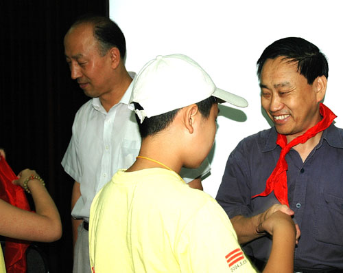 前来参加科普活动的孩子们为所领导佩带红领巾。