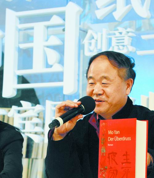 2009年,莫言在法兰克福书展上介绍其作品《生死疲劳》。 新华社供图
